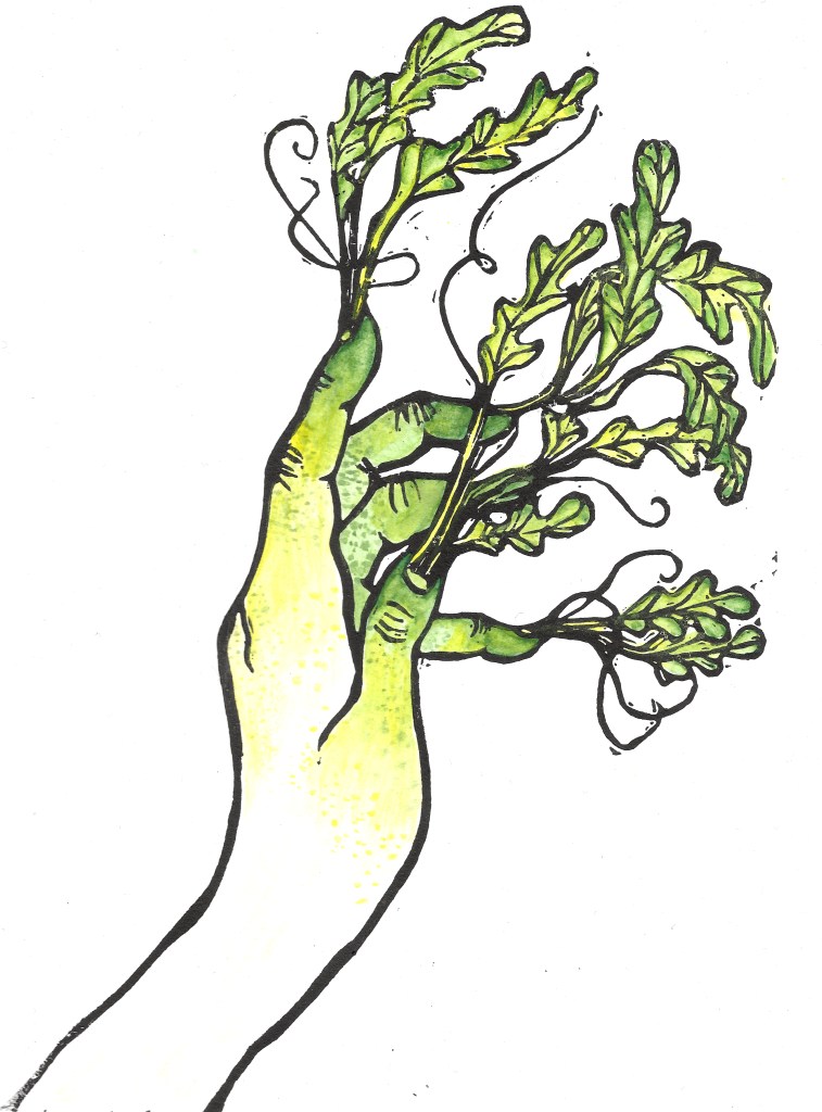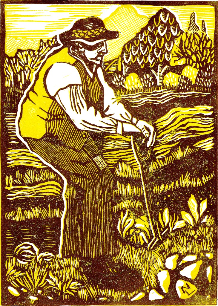 Image: Greenfingered, 2024. Hand coloured linocut by Jennie Syson